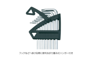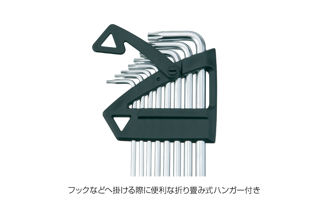 耐久性に優れる高品質な特殊鋼SNCM-V鋼を採用した8本組Torx®(トルクス)レンチセットです。効率的で正確な作業をサポートするツールです。折り畳み式のフック等に吊り下げられるブラケットが付属しており、壁に掛けて簡単に保管可能。便利さと耐久性を兼ね備えた必須のツールセットです。