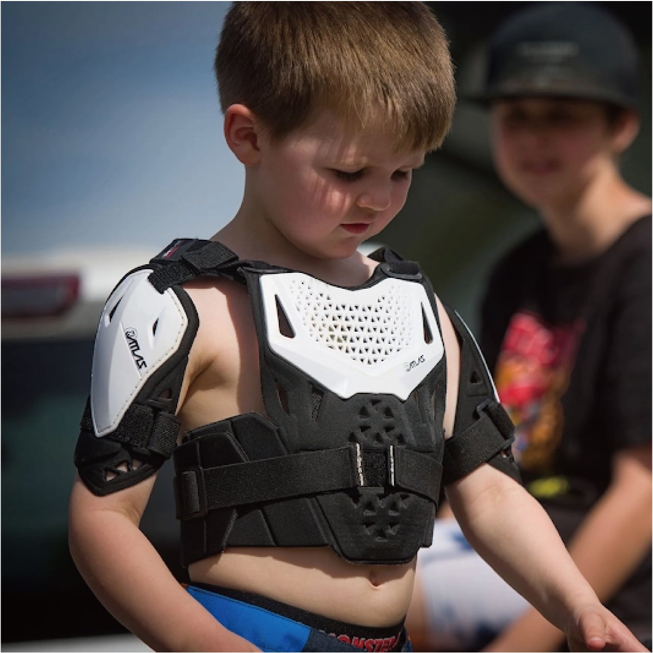 アトラスネックブレースとのフィッティングが完璧な、CEプロテクター装備のキッズ向けのボディアーマー。