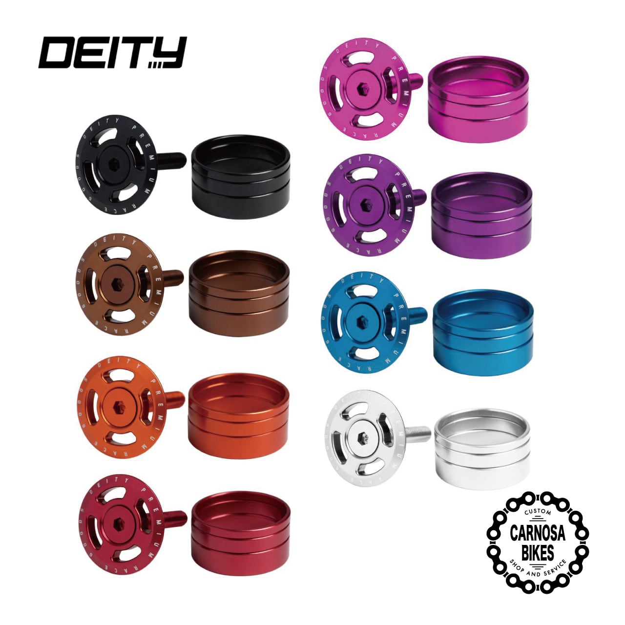 DEITYらしいスタイルとディテールを体現したCROSSHAIR(クロスヘアー)は、DEITY製品に期待される美しさと精巧さを兼ね備えています。3mm、5mm、8mmのスペーサーが付属しており、カラーを統一することで、コックピットを洗練された印象に仕上げることができます。キャップとスペーサーは6061アルミニウムから削り出されており、ボルトには7075アルミニウムをCNC加工して使用。高精度かつ非常に耐久性の高いセンターピースとなっており、ストレスフリーな使用感を実現しています。