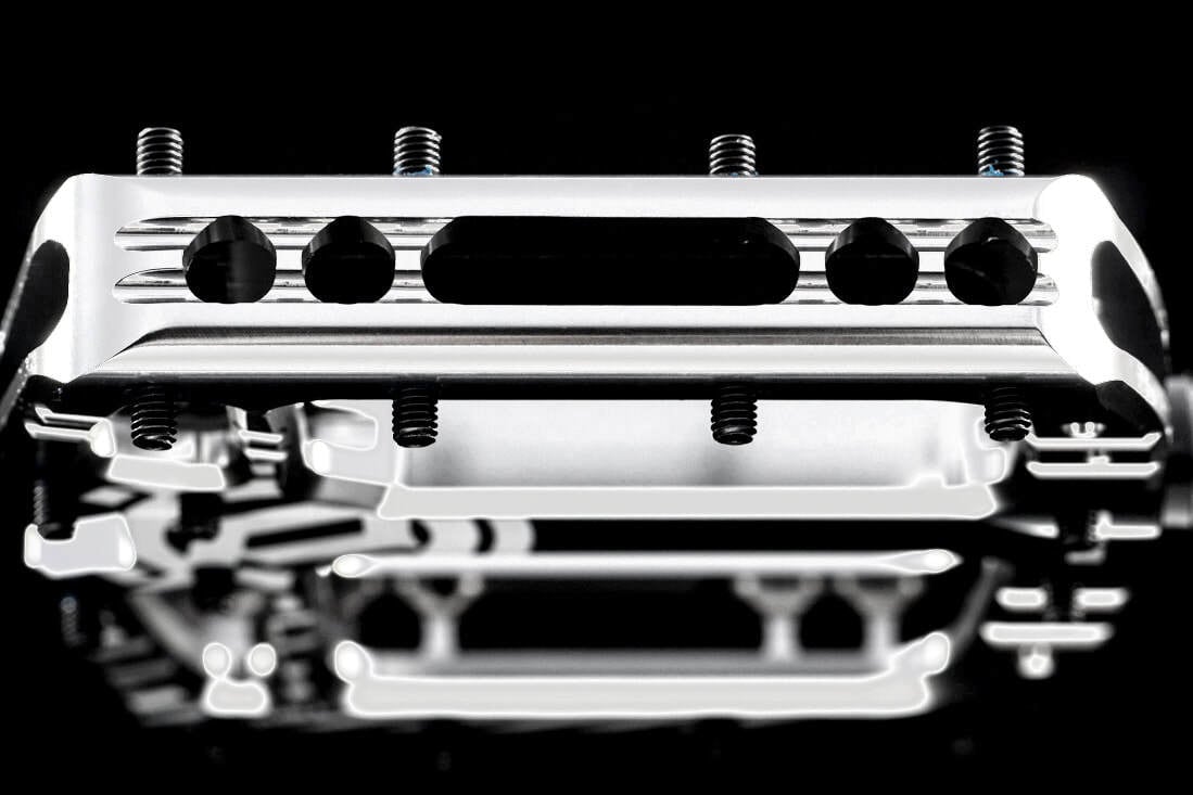 オフセットのない設計により、ペダルスピンドルの前後で均等な荷重配分を実現し、110mm×105mmのサイズながら、まるで史上最大サイズのペダルを踏み込んでいるかのような安定感をもたらします。