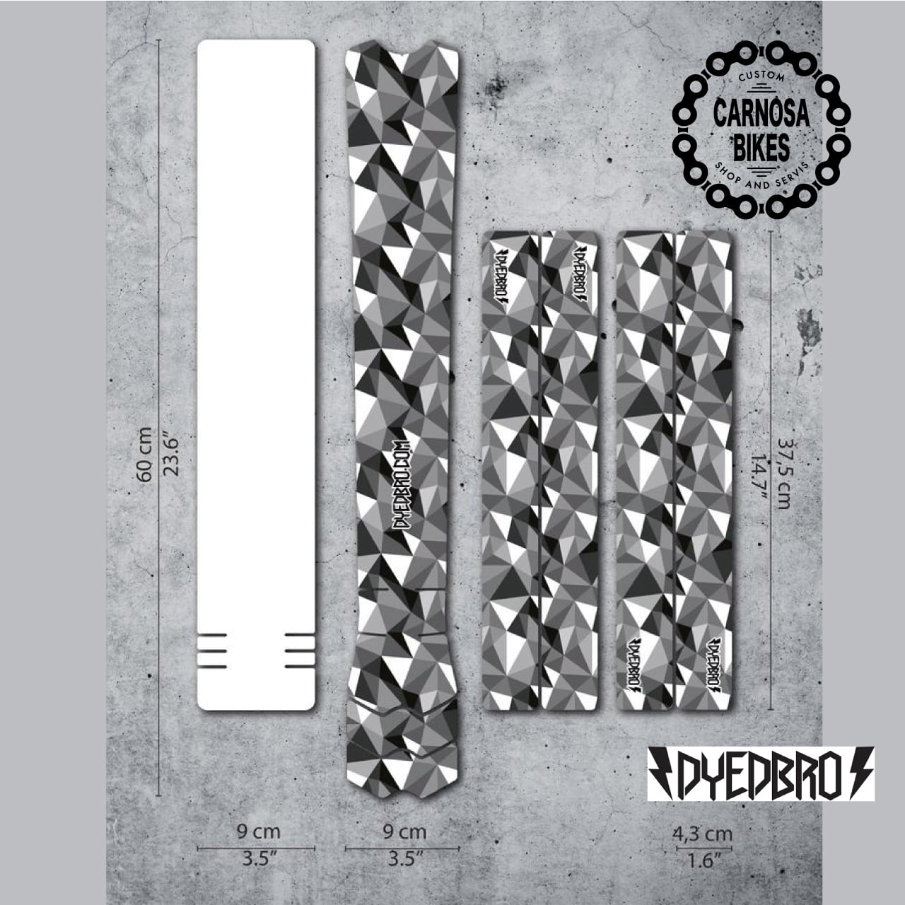 DYEDBRO フレームプロテクションはラテックスインク印刷の施された、厚み300μmの高品質な保護ビニールシートを使用したプロテクションシートで、自転車の走行の際に生じる土砂・水しぶきへの耐性があります。フレームを擦り傷から守り最高の状態に保つのに役立ちます。さまざまなフレームに使用できるようにダイカットされた自転車1台分のセットです。